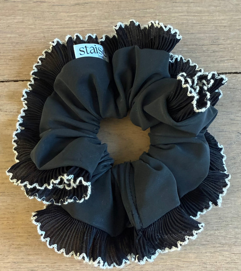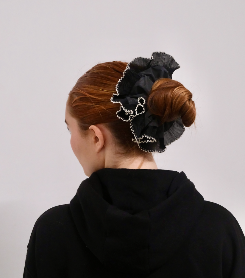 handmade in the UK from deadstock (where we can) silks to crisp cottons. Chosen with care and often sewn in limited runs. Designed to hold tight without pulling, they’re gentle on your hair, light enough for fine strands, and cute enough to double as a wrist accessory.