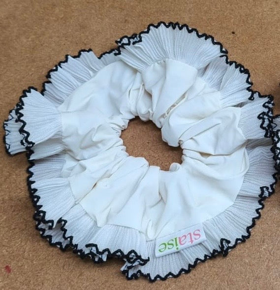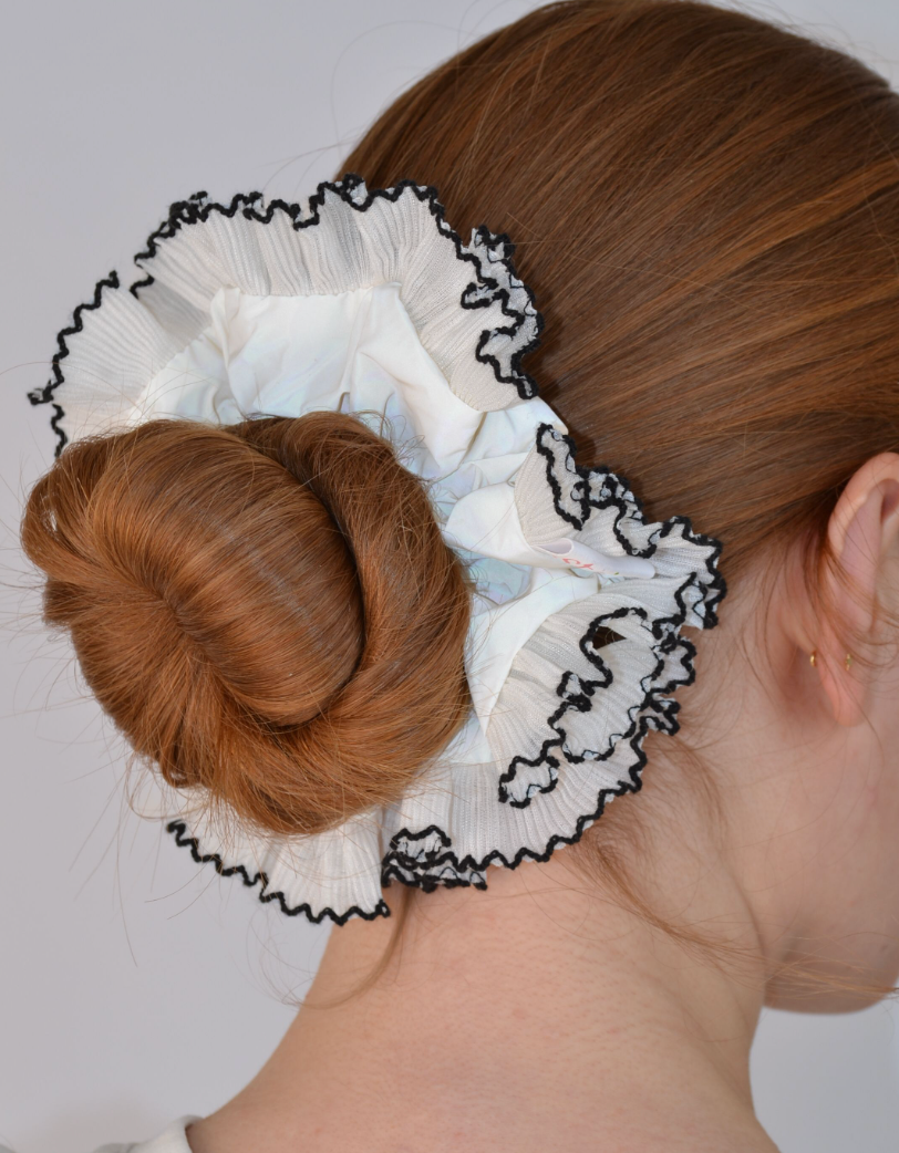 handmade in the UK from deadstock (where we can) silks to crisp cottons. Chosen with care and often sewn in limited runs. Designed to hold tight without pulling, they’re gentle on your hair, light enough for fine strands, and cute enough to double as a wrist accessory.